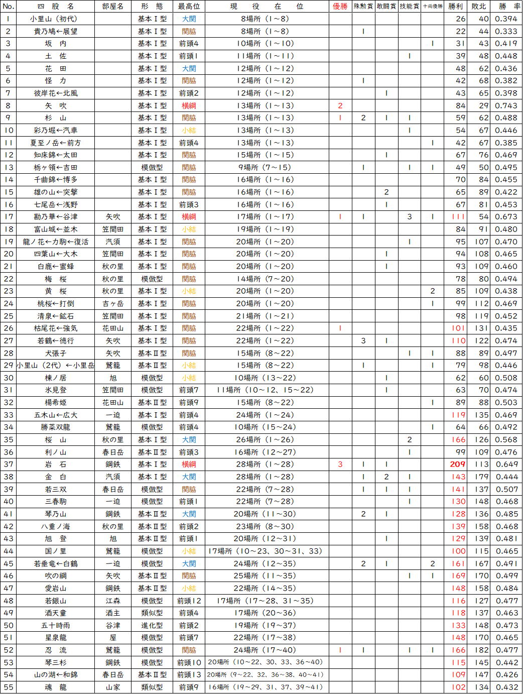 引退力士の記録
